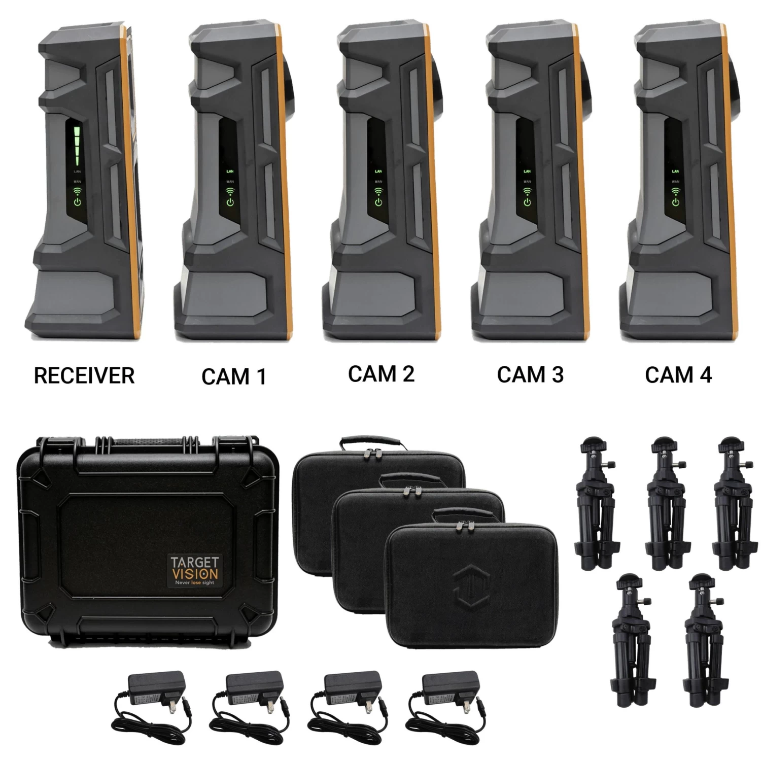 Includes: Camera, Receiver, 3 Extra Cameras, Hard Case, 2